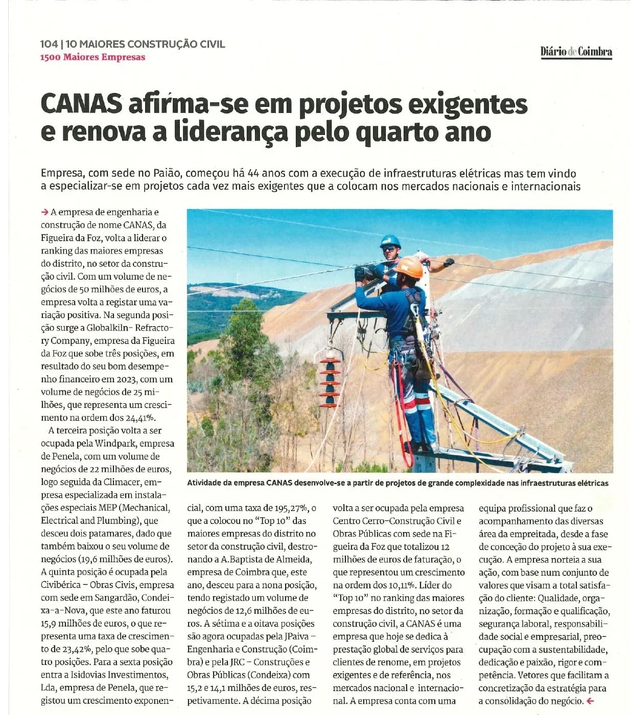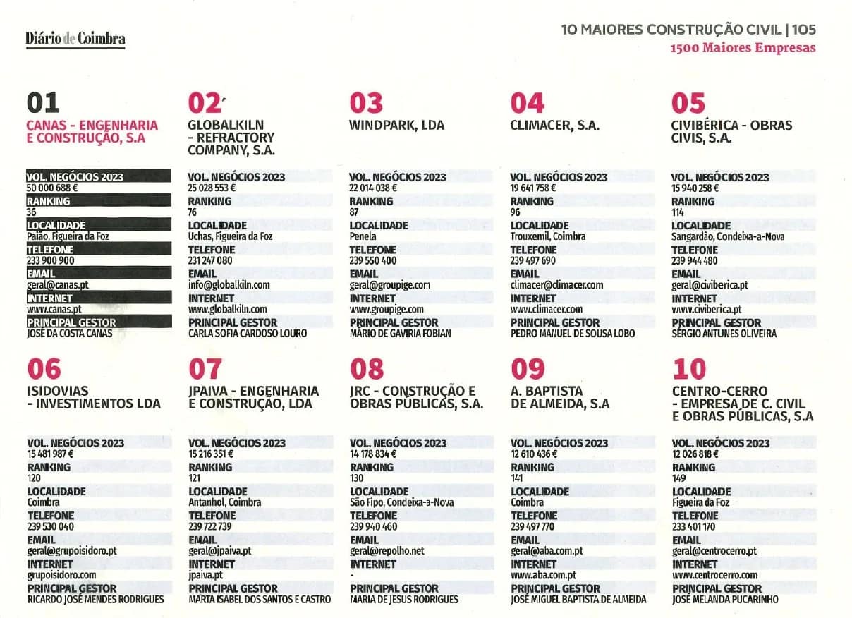 A CANAS – Engenharia e Construção, S.A. foi reconhecida, em 2023, como Líder do Ranking das Empresas de Construção Civil do Distrito de Coimbra, pela Revista das 1500 Maiores Empresas do Distrito de Coimbra, publicada no passado dia 11 de dezembro, pelo Diário de Coimbra.