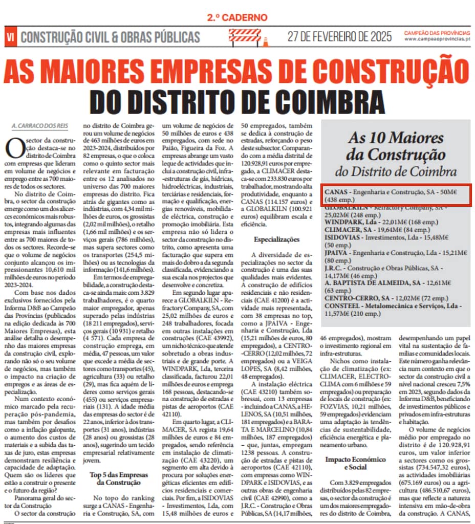A CANAS – Engenharia e Construção, S.A. foi reconhecida, em 2023, com um volume de negócios de 50 Milhões de Euros, como Líder do Ranking das Empresas de Construção Civil do Distrito de Coimbra, pelo Jornal Campeão das Províncias, numa publicação feita no passado dia 27 de Fevereiro.